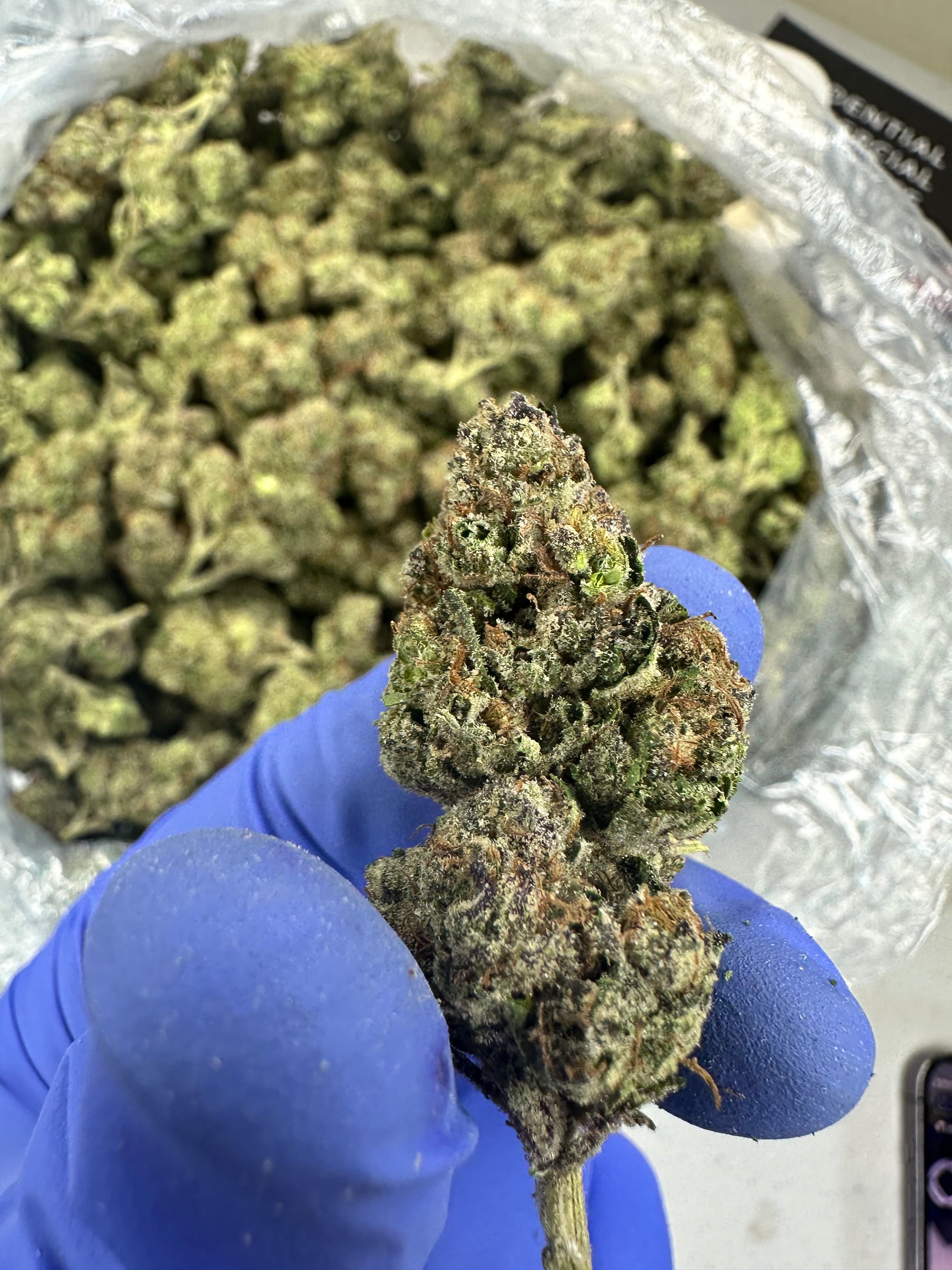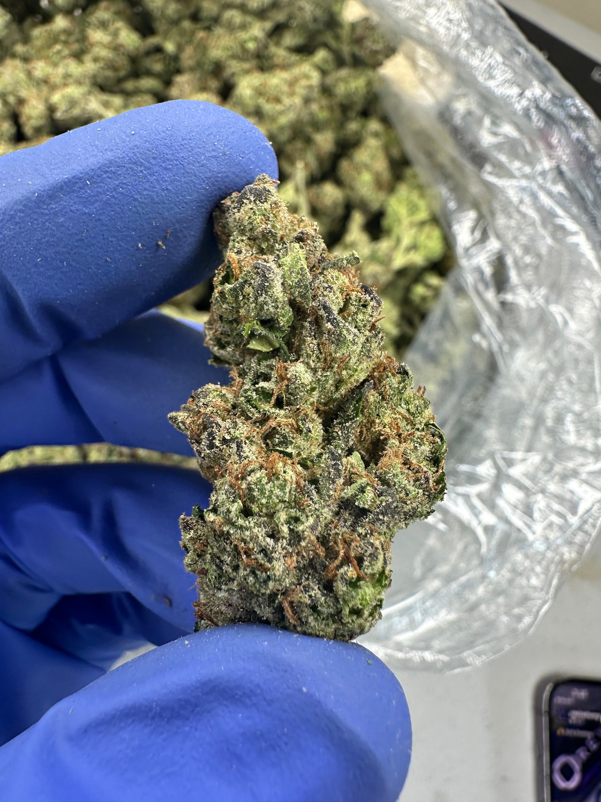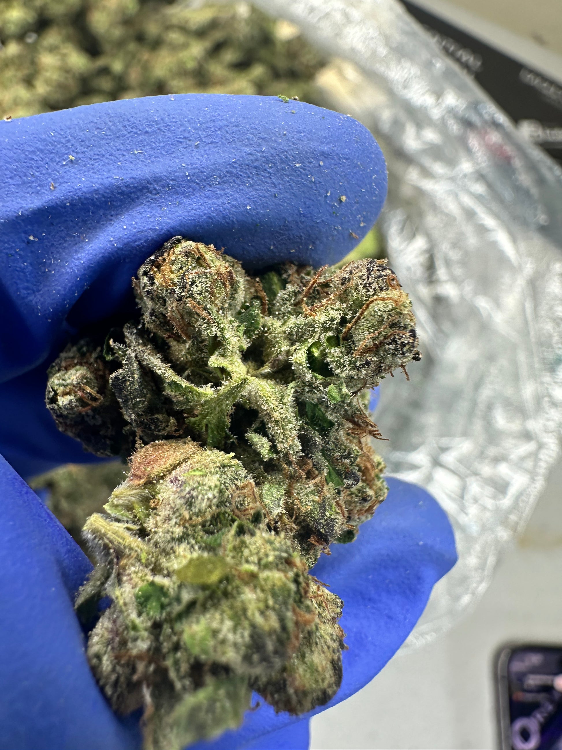 - Appearance: Dense, triangular-shaped buds show off a vibrant mix of dark green and purple hues, with fiery orange pistils. The entire bud is coated in frosty white trichomes.
