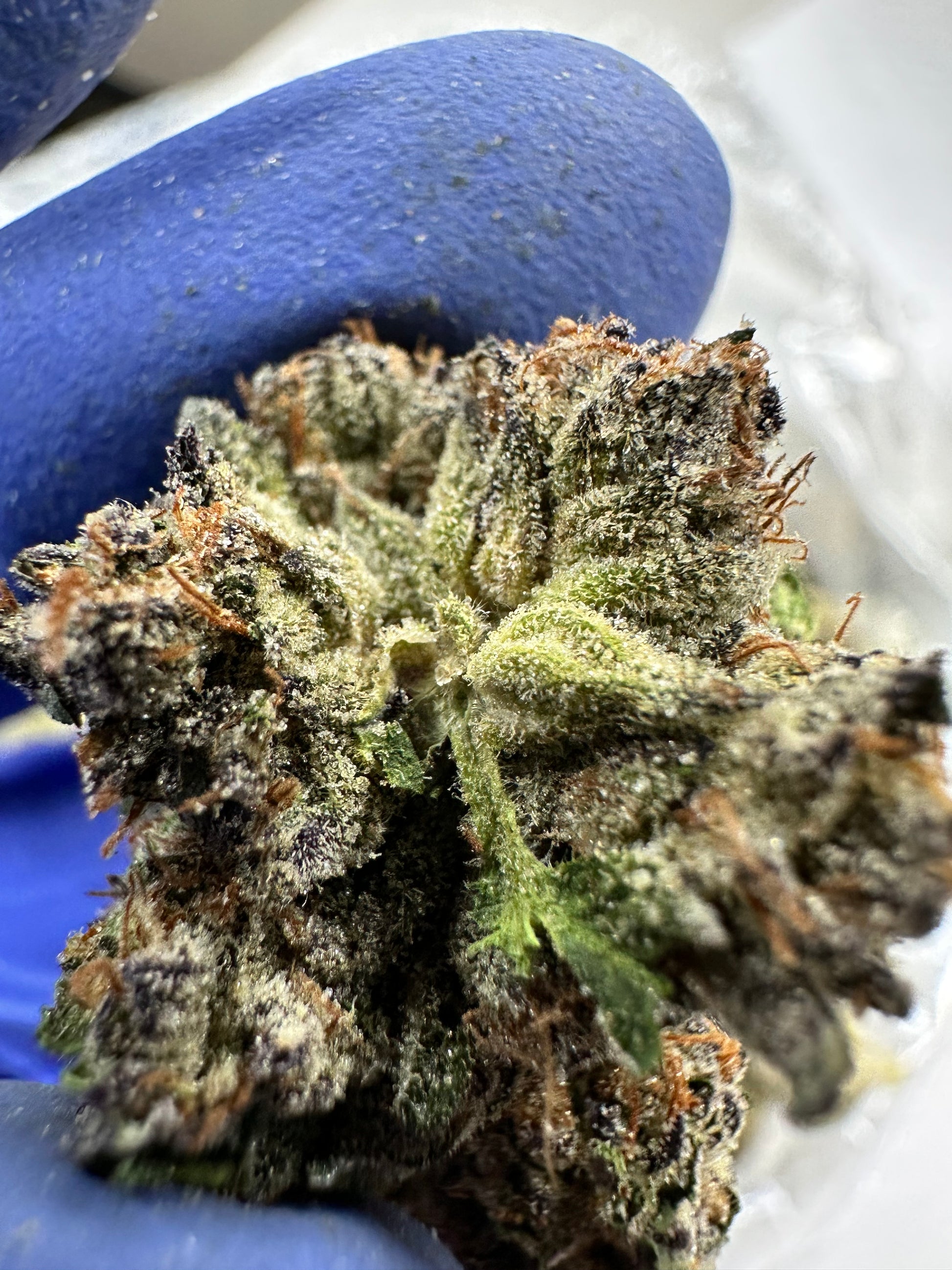 Kush Cake buds are generally dense and chunky, featuring a mix of vibrant lime green and deeper green leaves, often with hints of purple. They are interwoven with amber or orange pistils and coated in a generous, frosty layer of white crystal trichomes.
