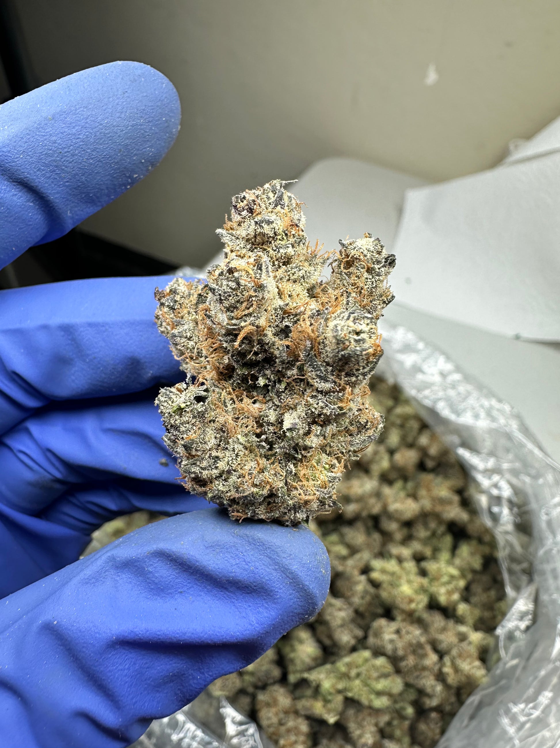 They are dense, triangular, and finished with a shimmering, heavy coat of frosty white trichomes. -