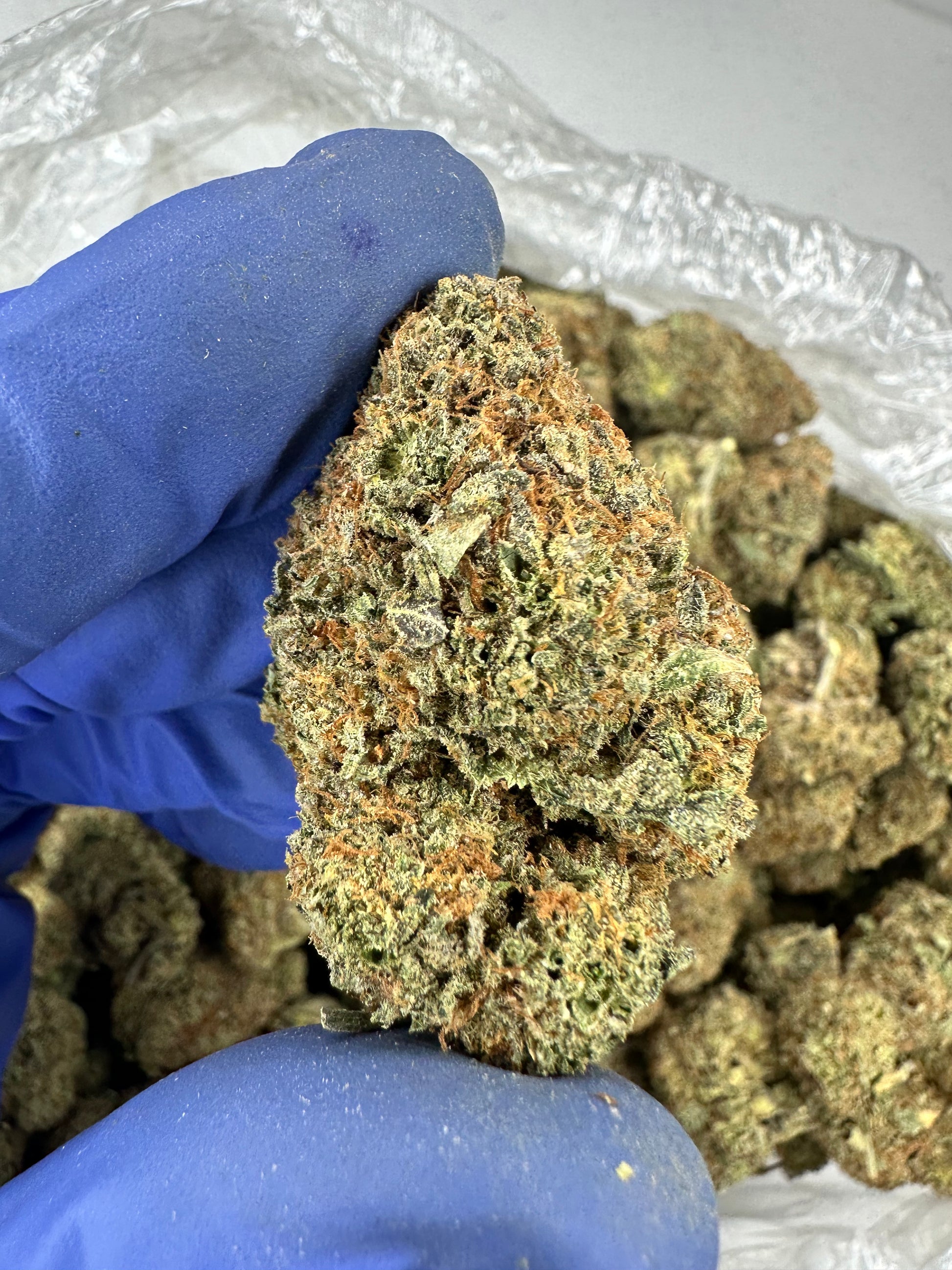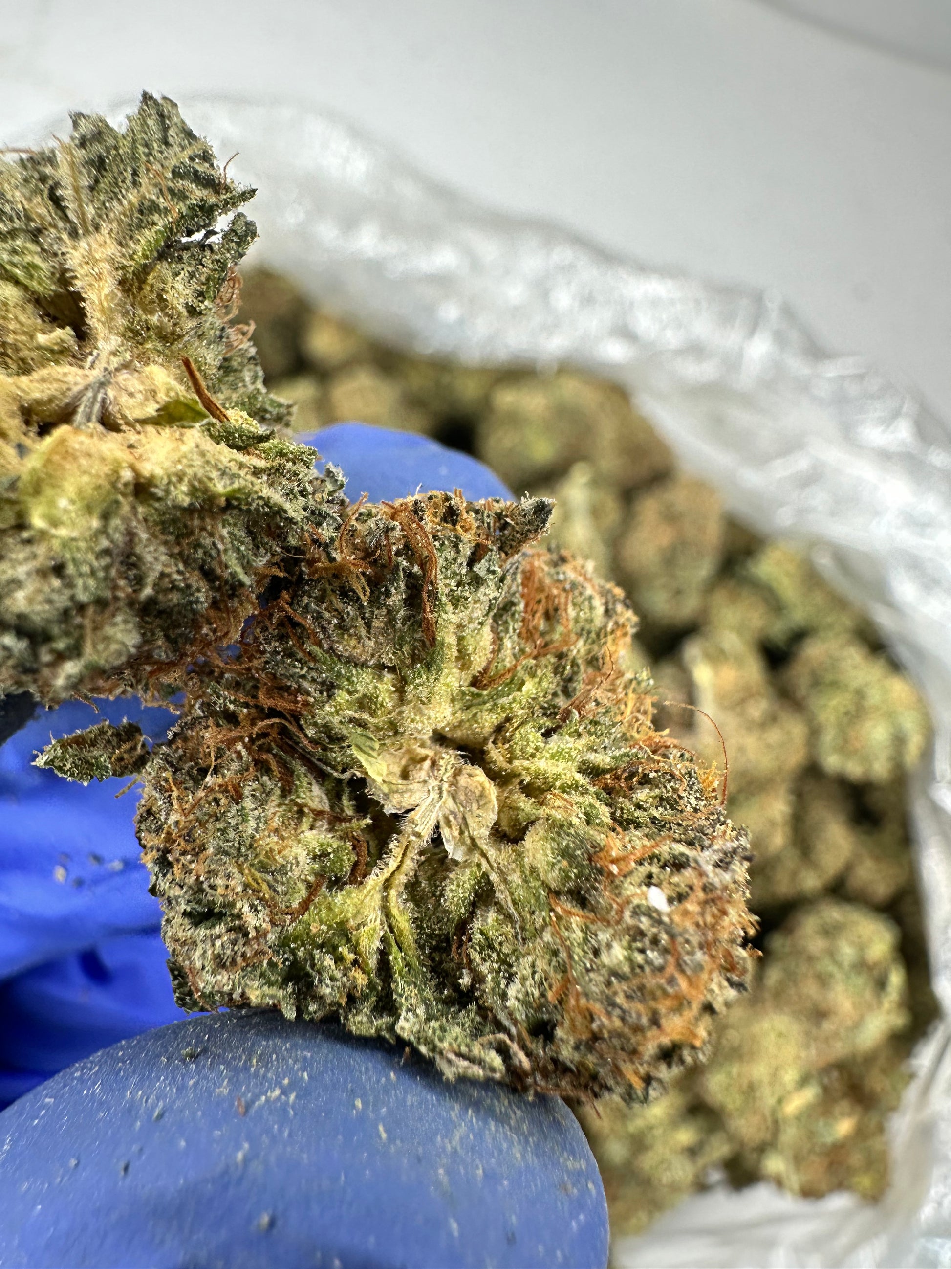 Appearance: This strain is a visual spectacle, with dense, oversized buds that often show a mix of deep green and dark purple hues. Fiery orange pistils contrast against the foliage, while a thick, frosty coating of white trichomes gives the buds a sparkling, "sugar-coated" appearance.