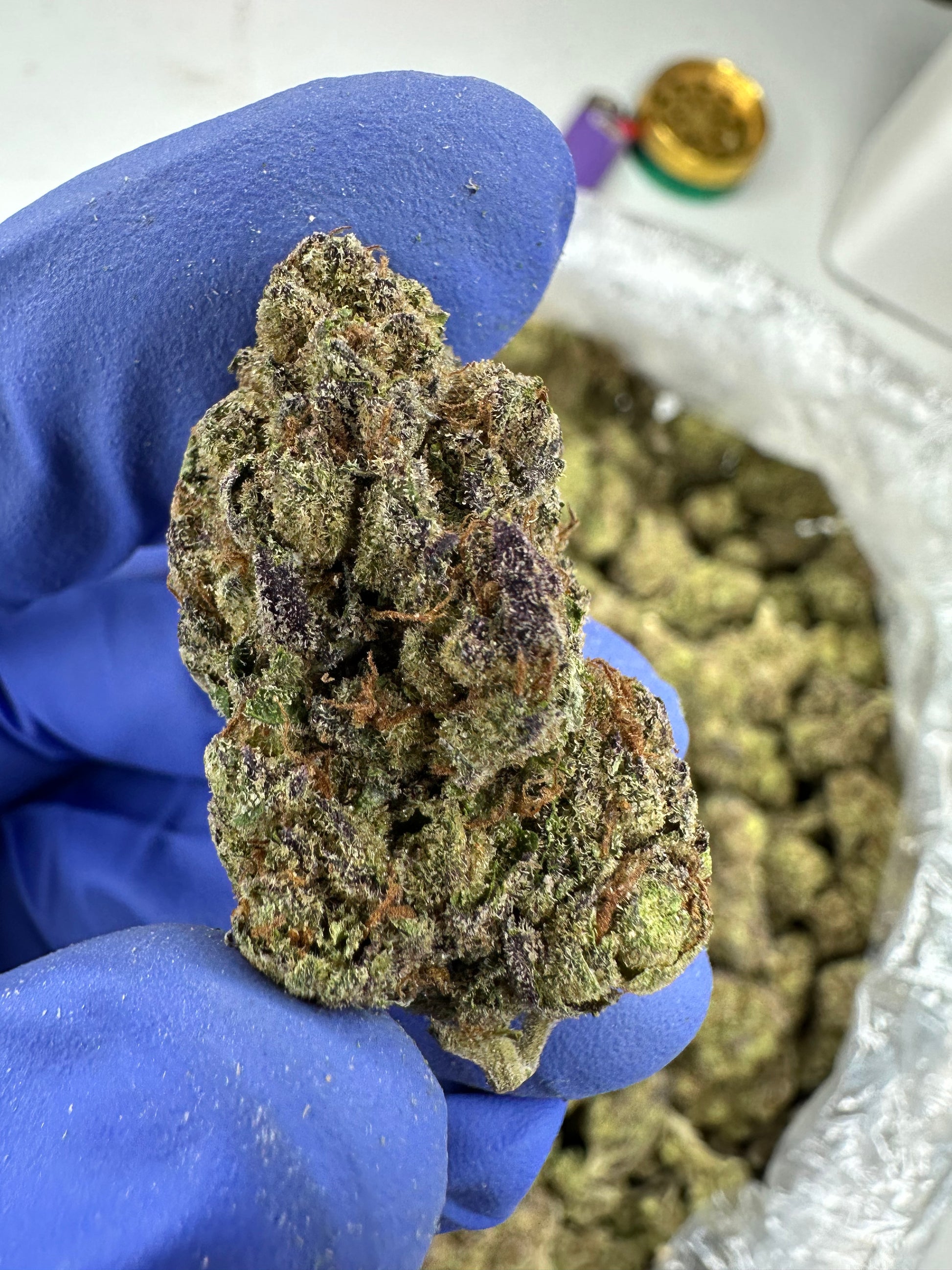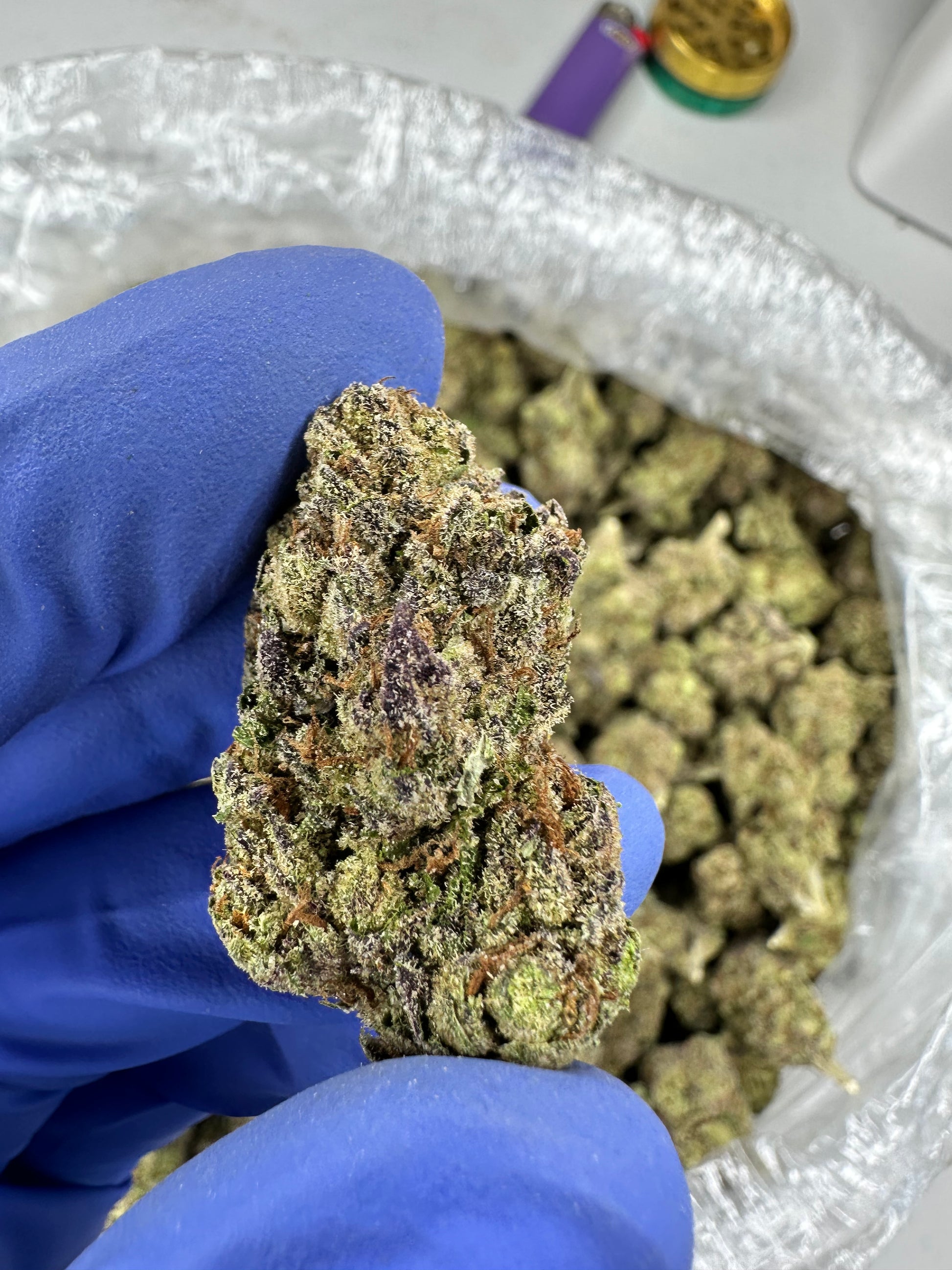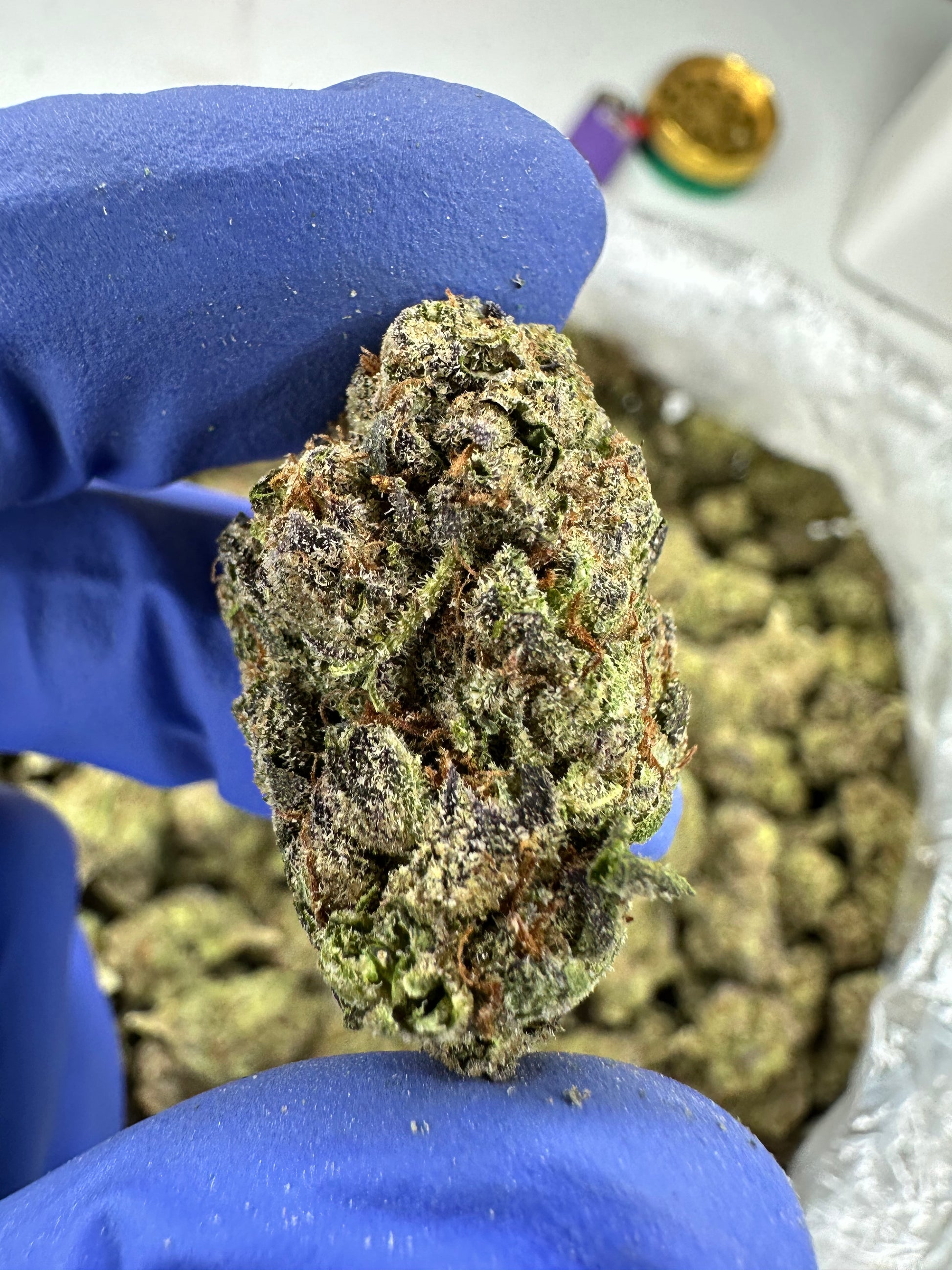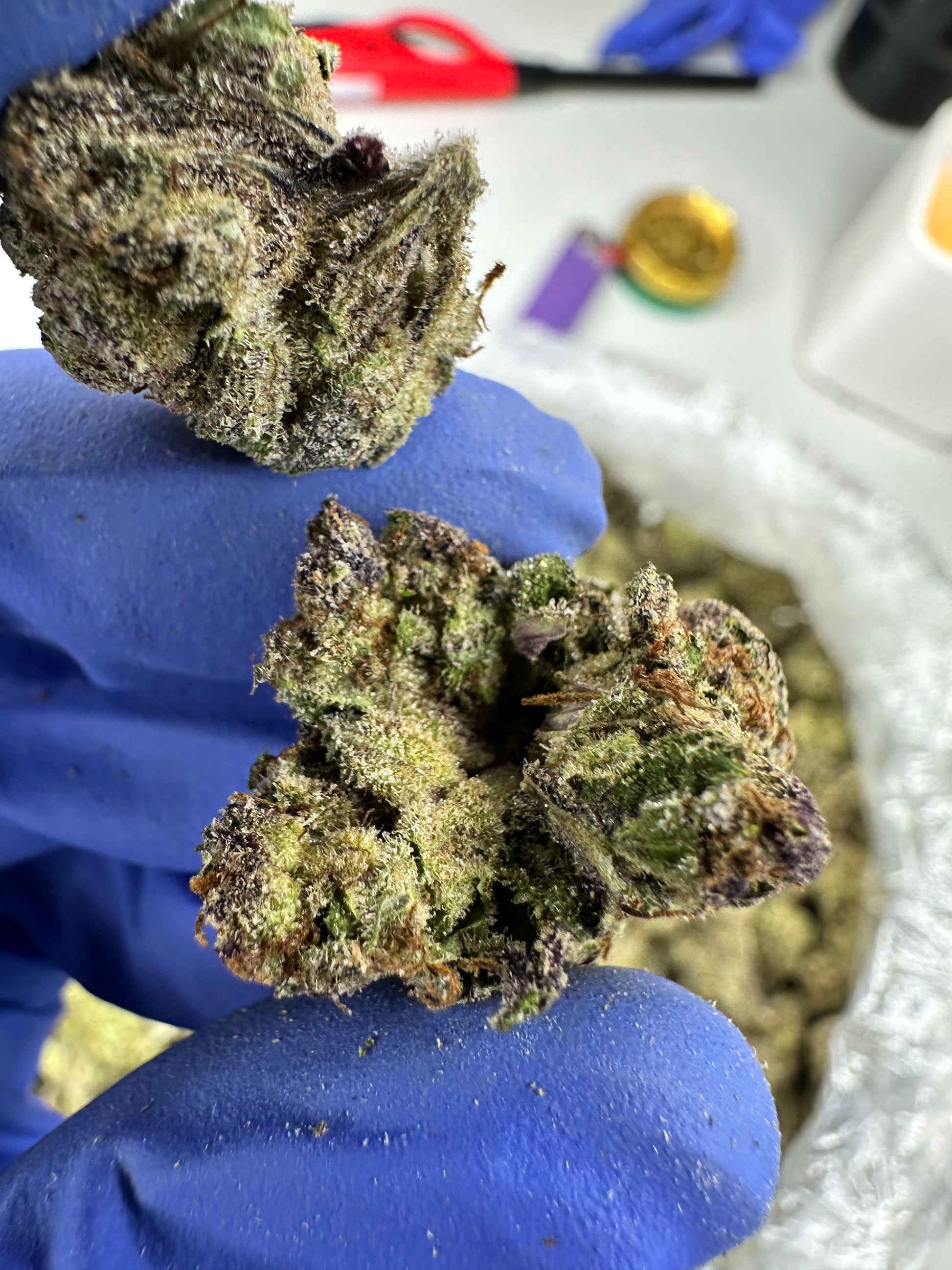 - Appearance: The buds are typically dense and oversized, with minty green nugs, thin amber hairs, and a frosty coating of crystal trichomes.