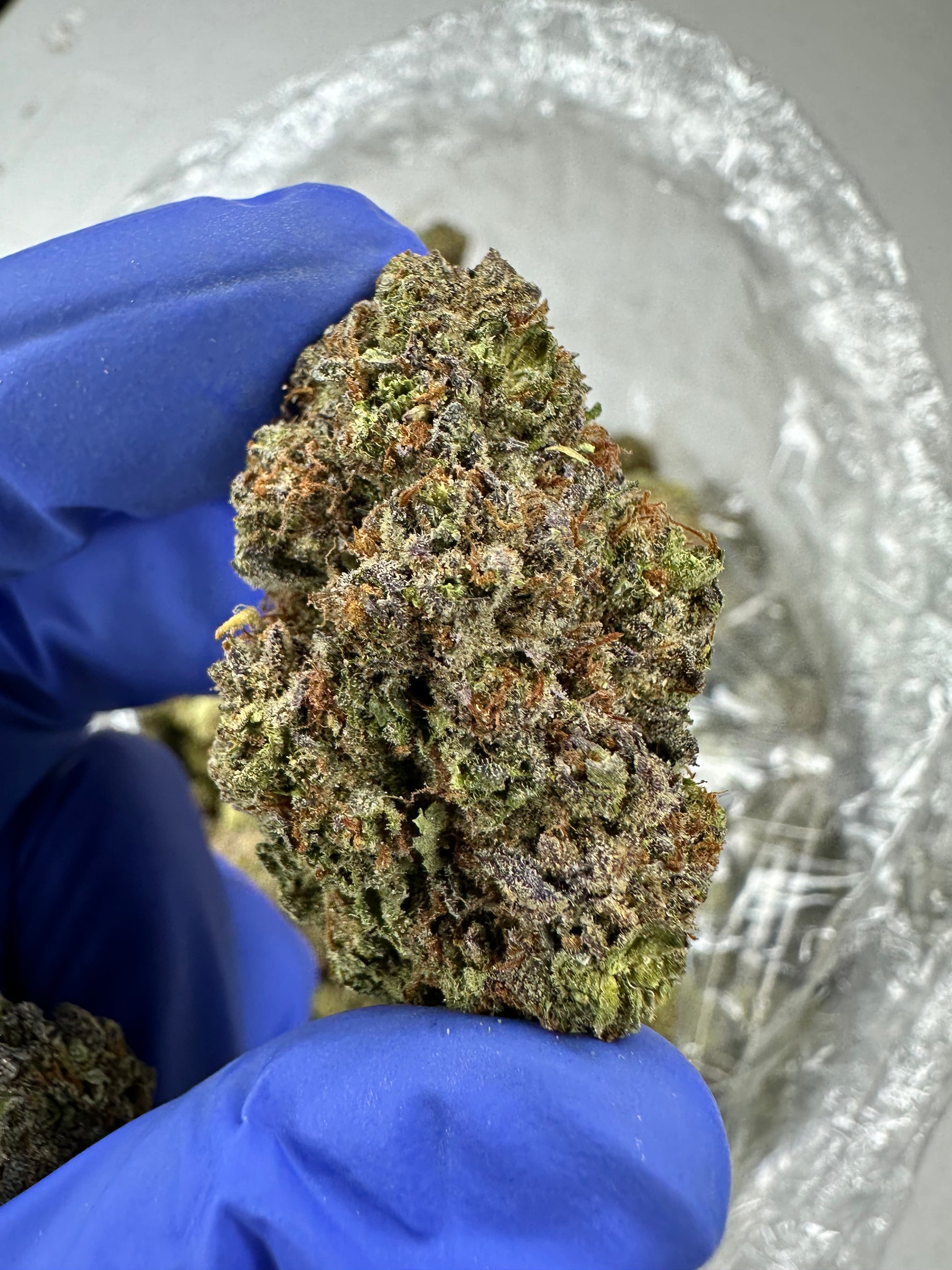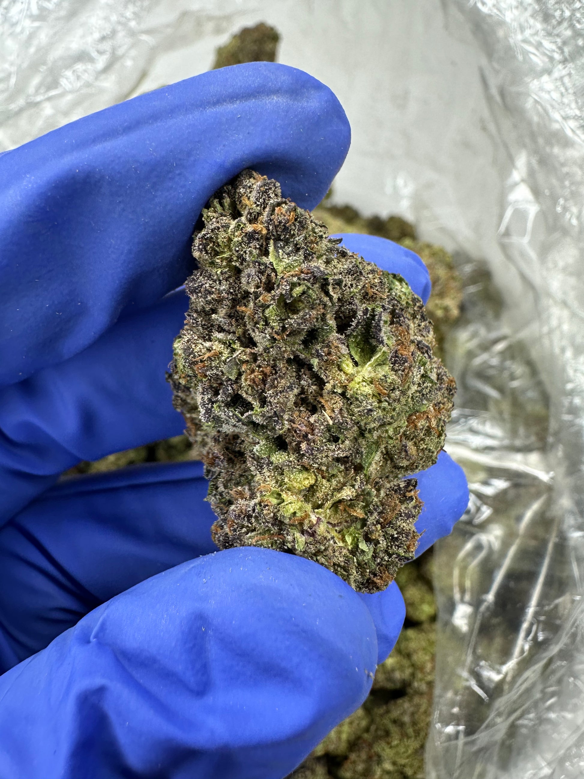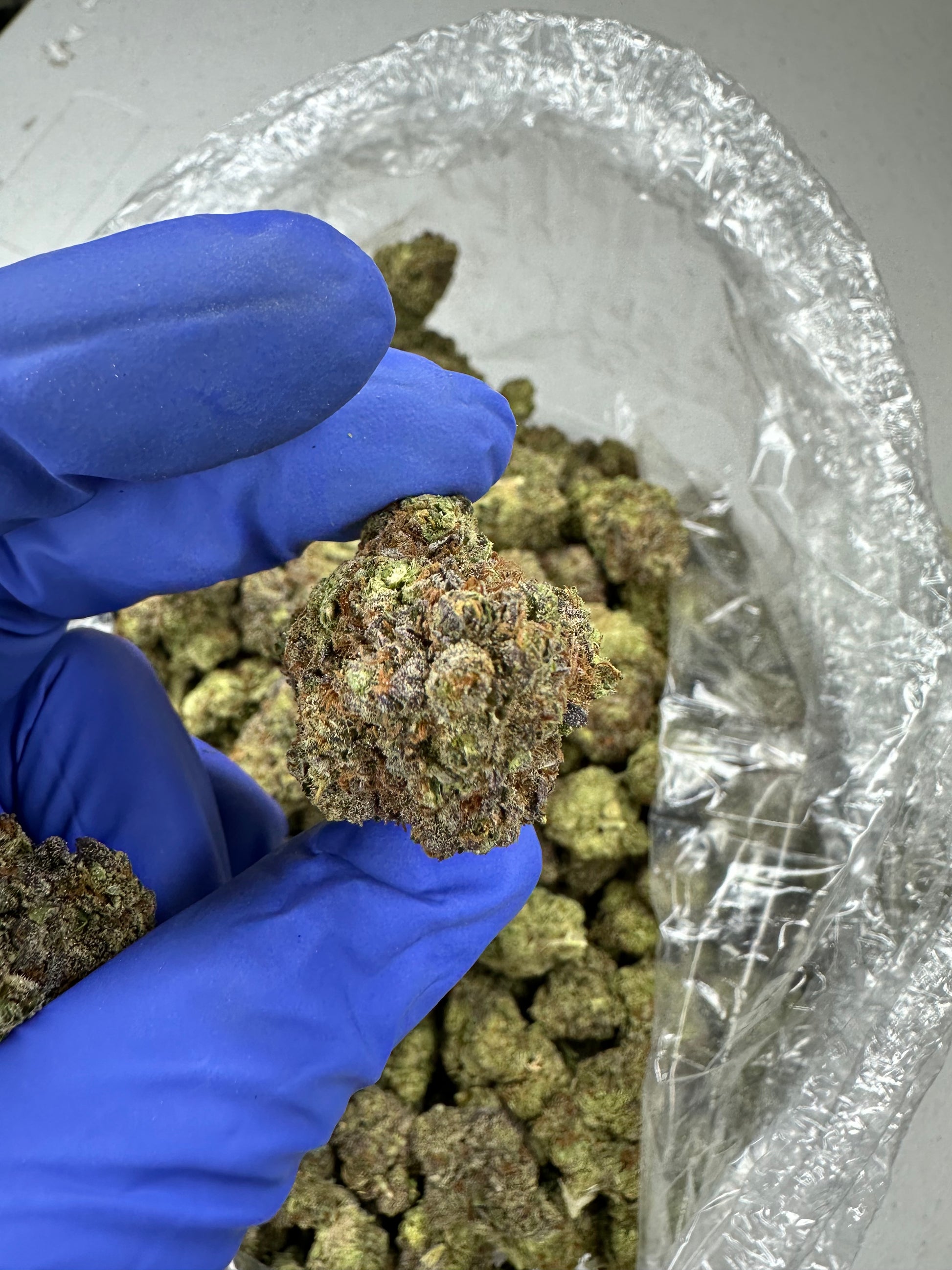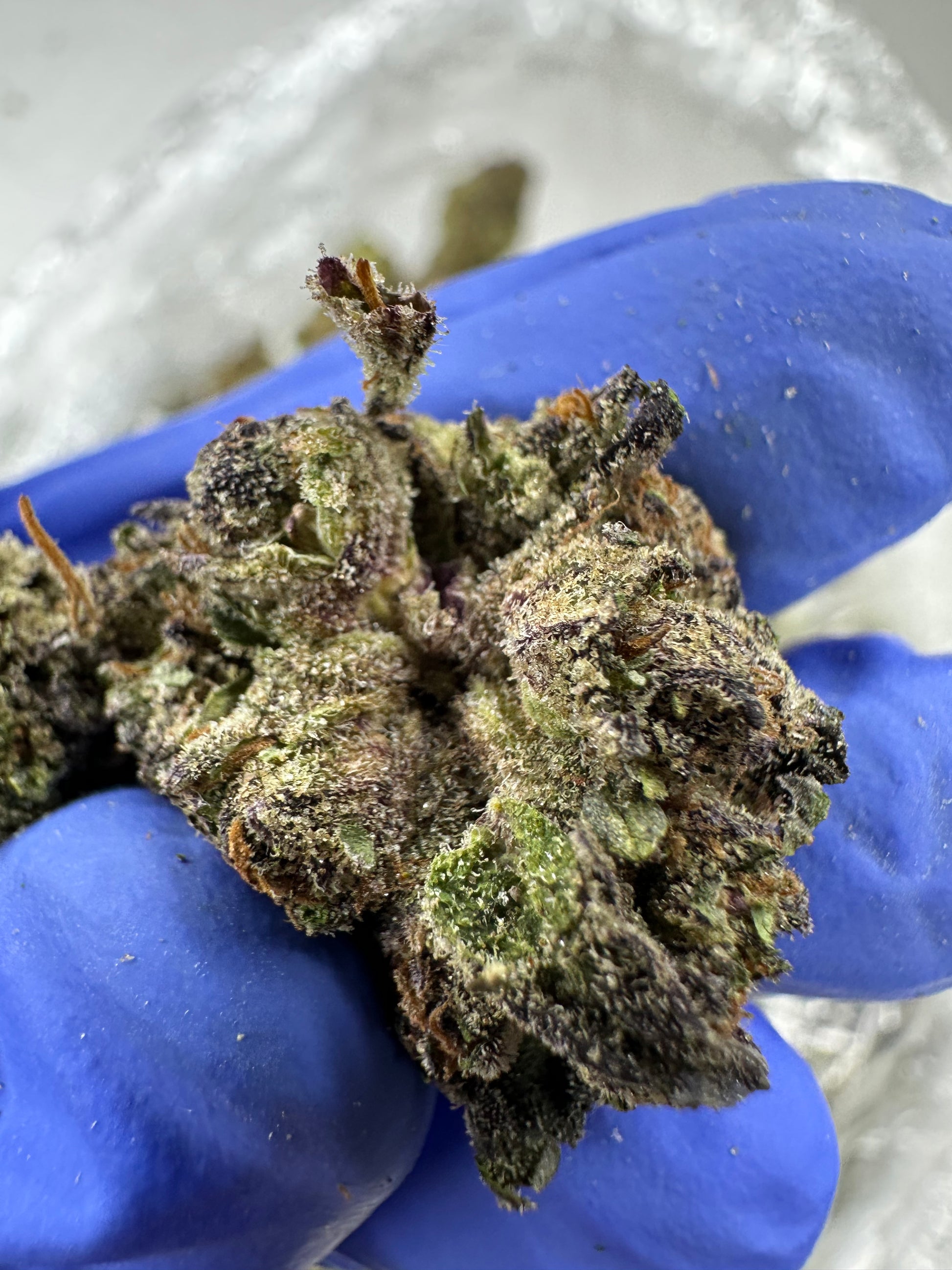 - They are dense and are completely covered in amber-yellow trichomes, giving them a frosty, potent appearance.