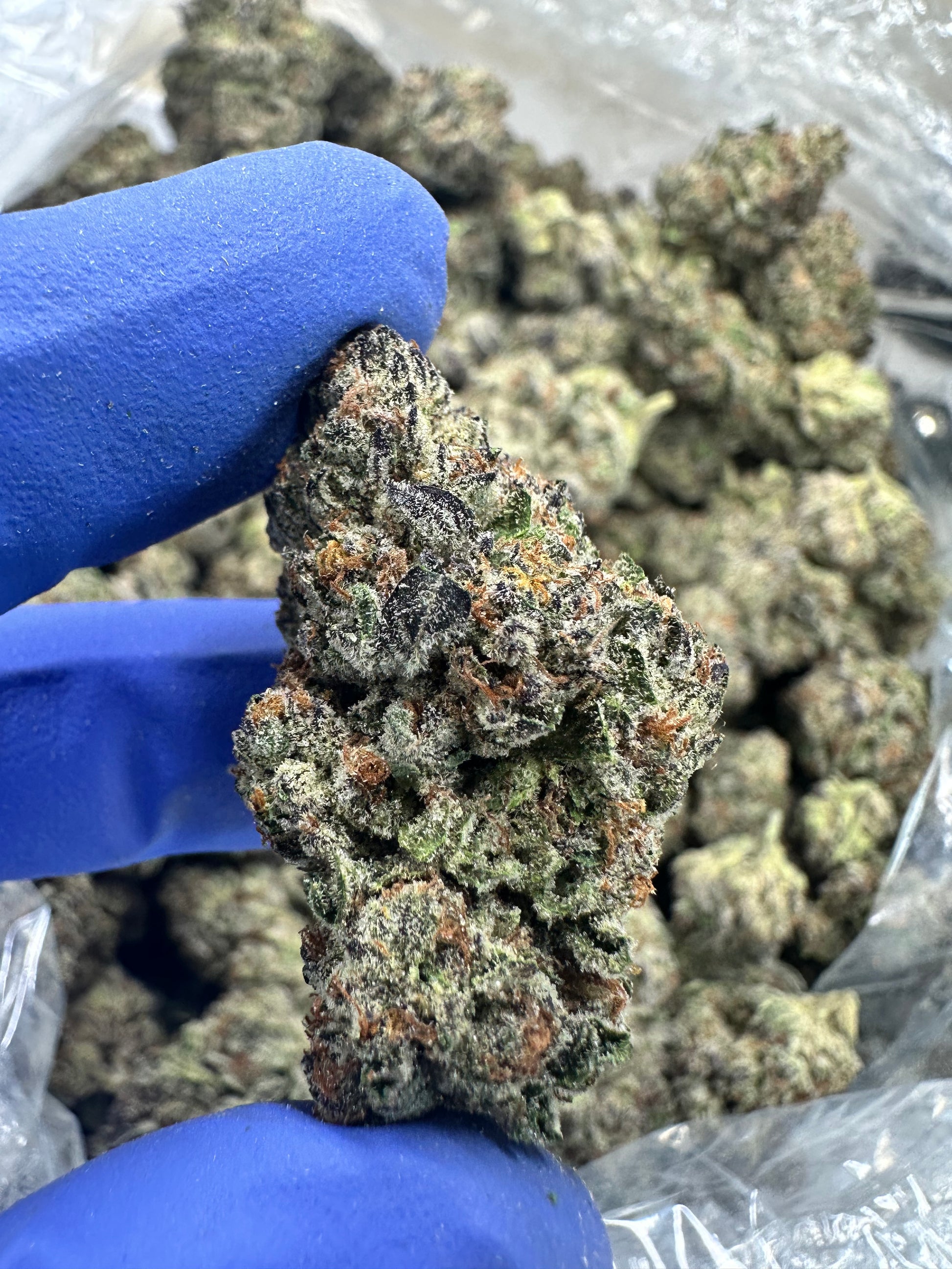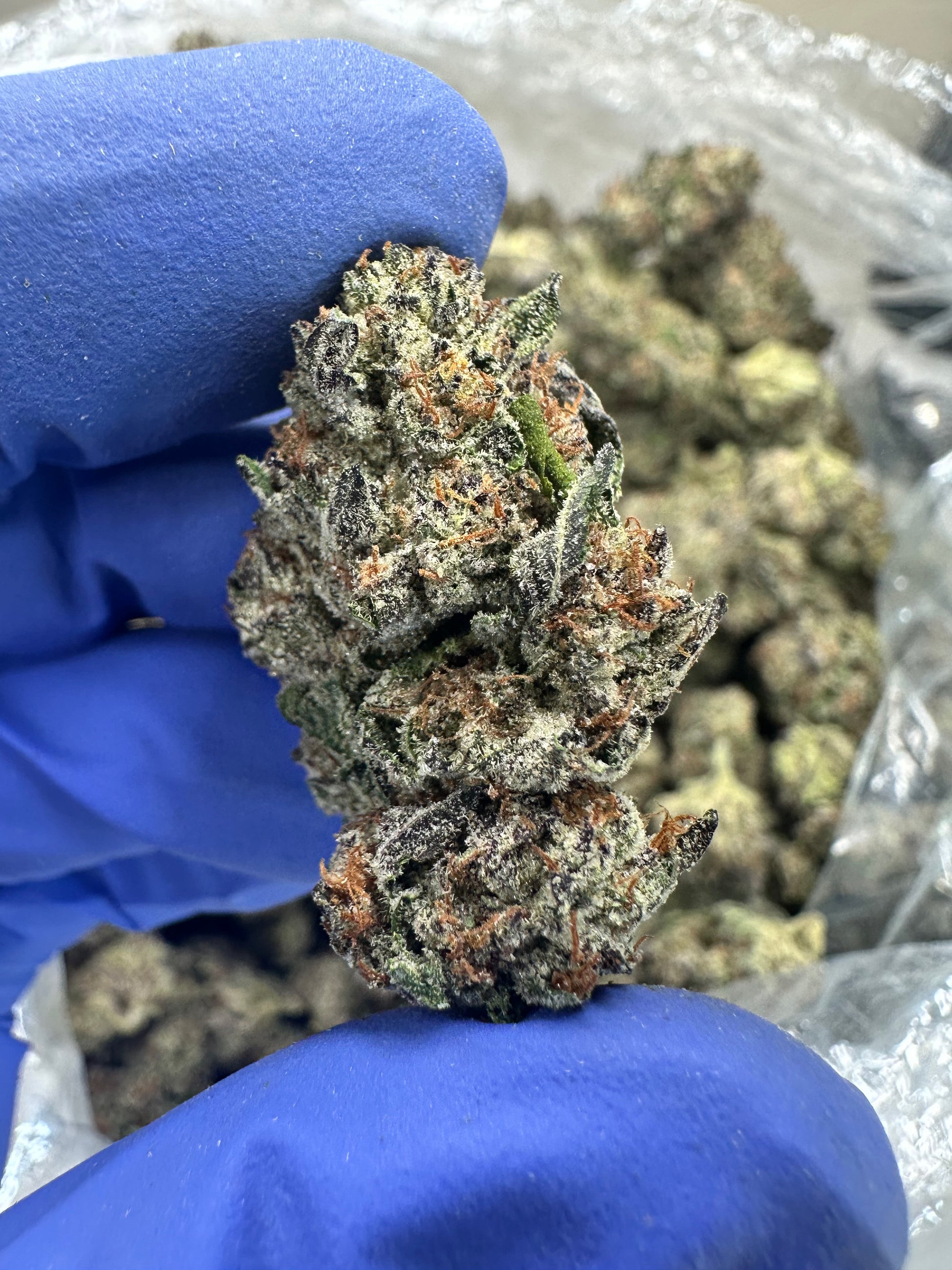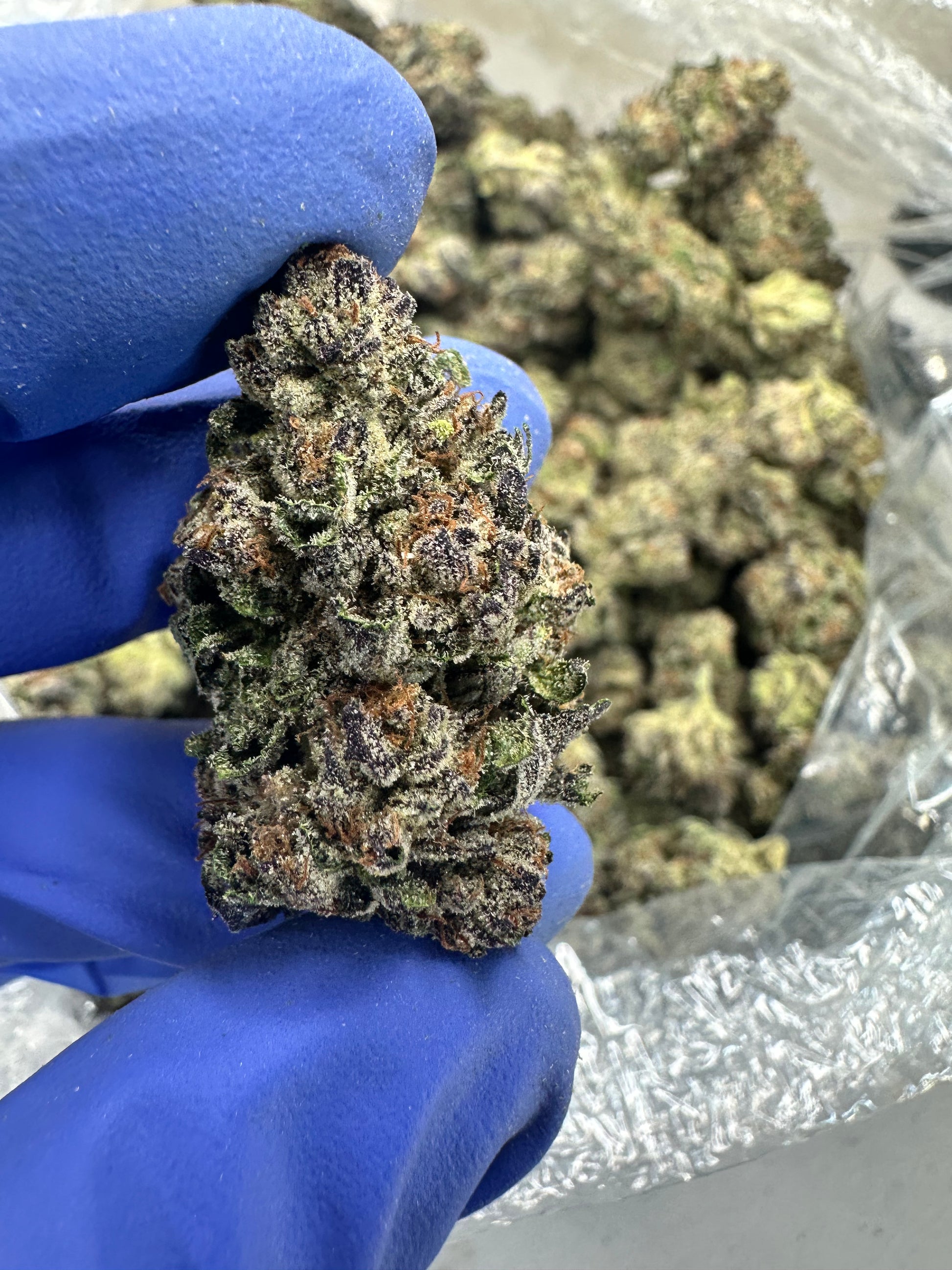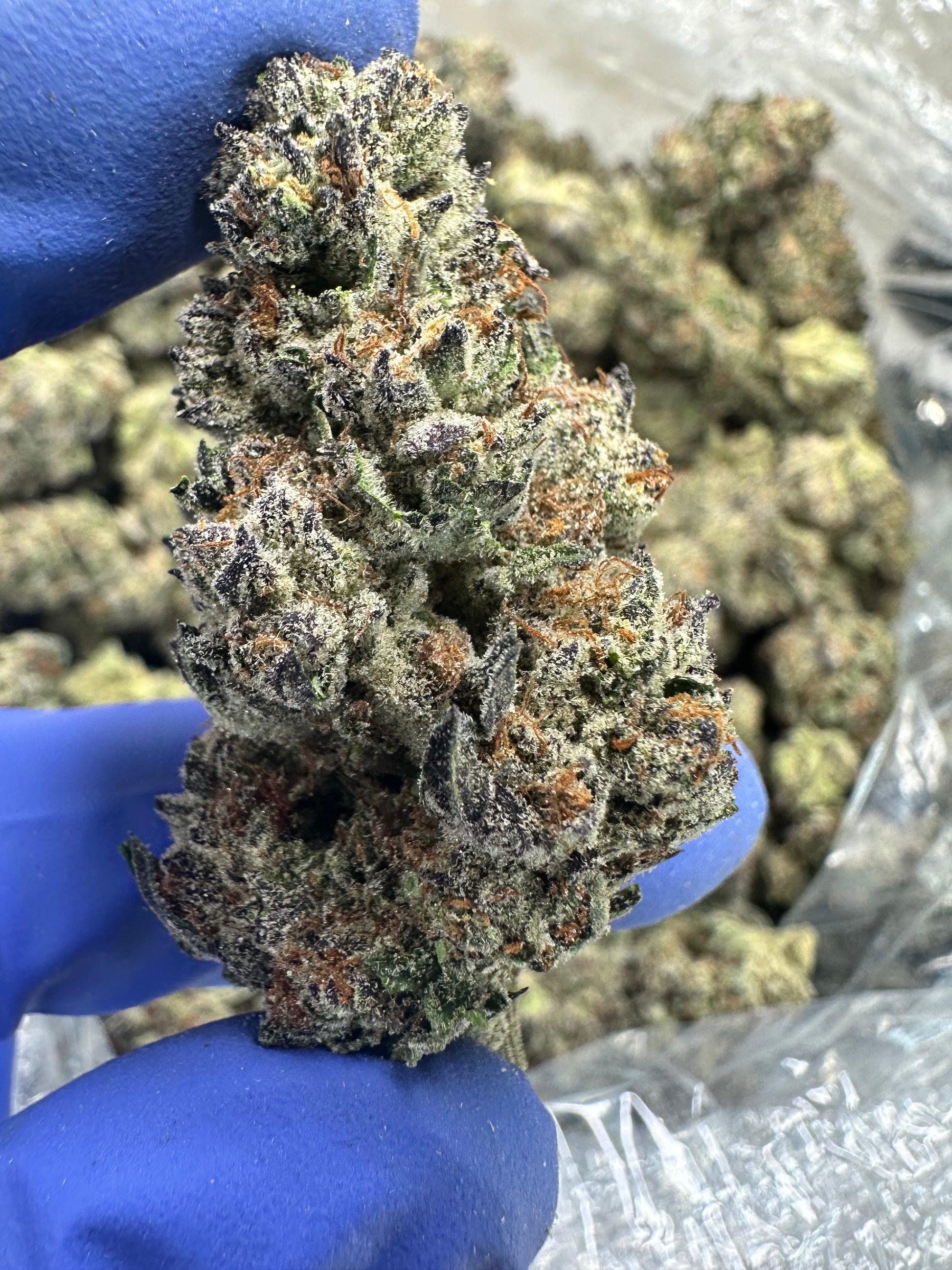 - Appearance: Dense buds with a mix of dark green and dark purple leaves, featuring vibrant orange pistils and a heavy dusting of frosty white trichomes.
