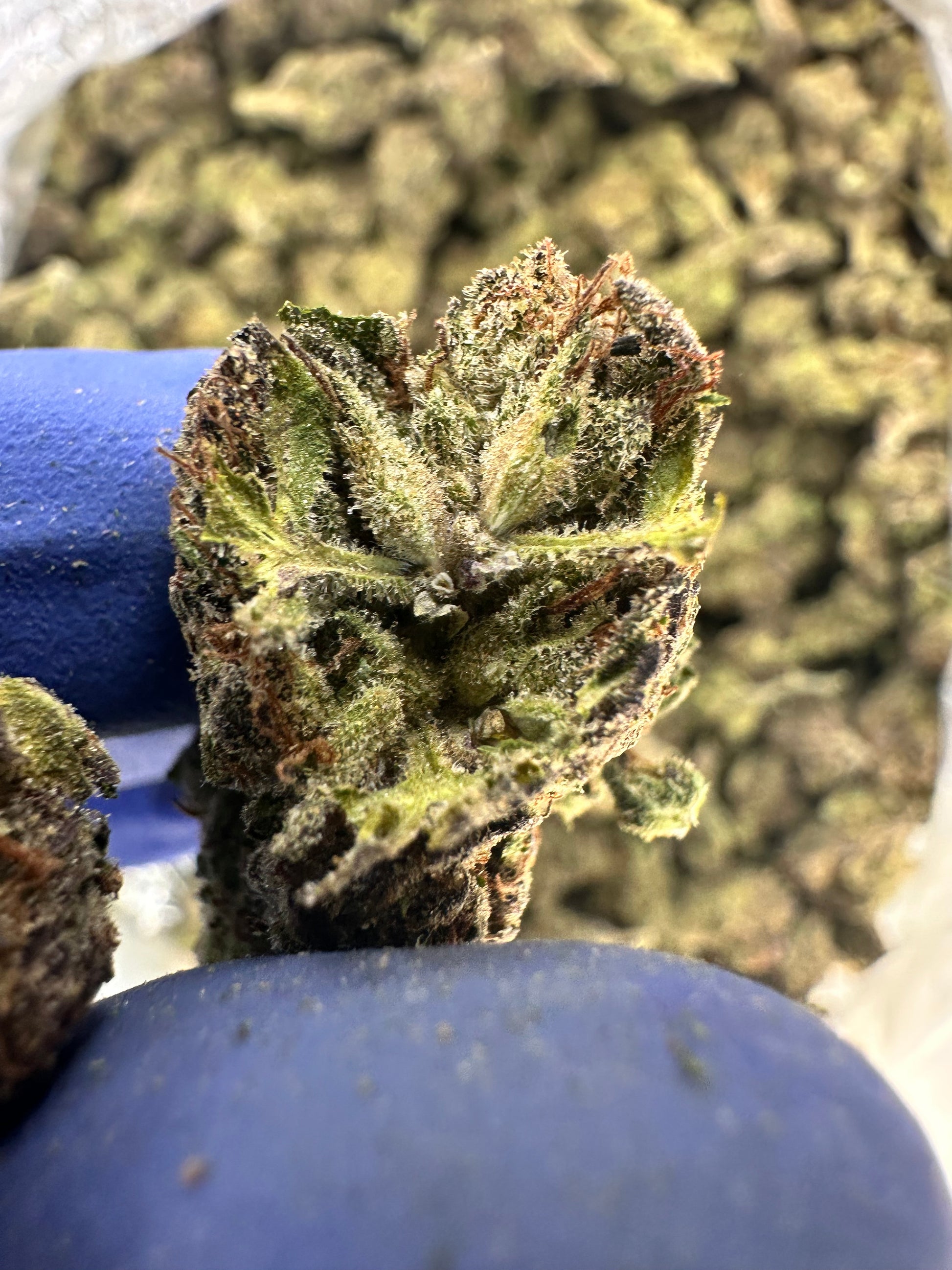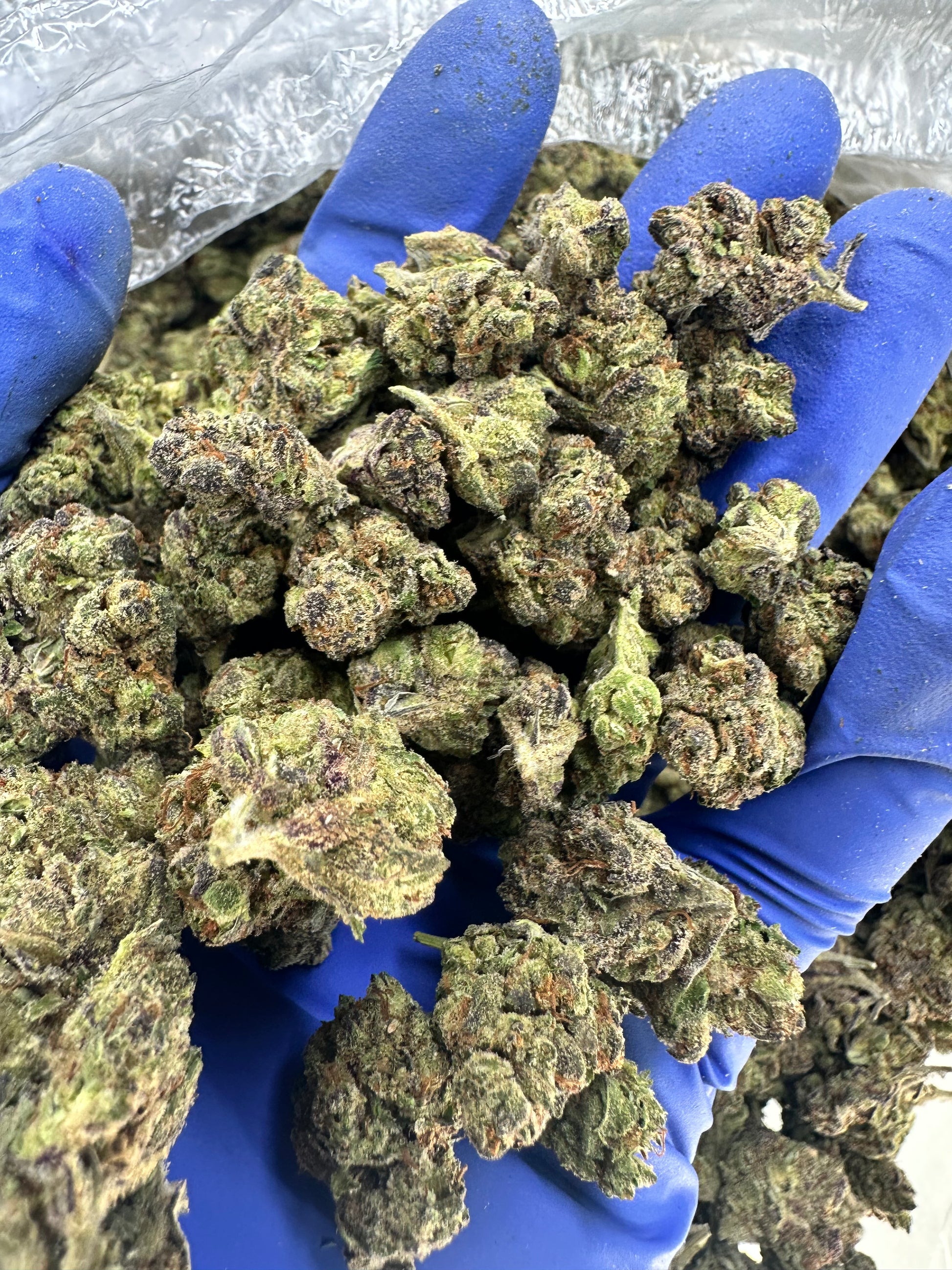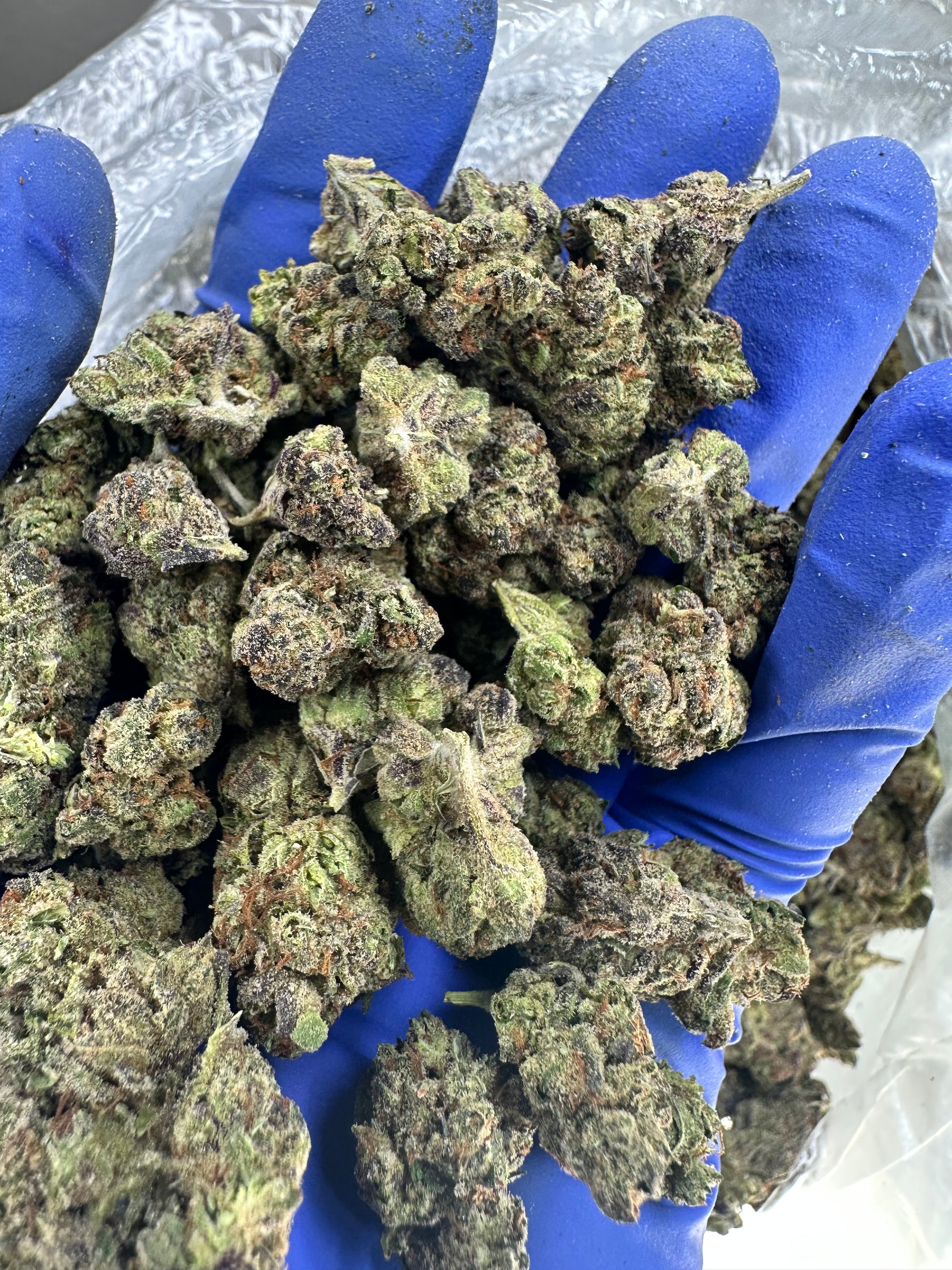 - Appearance: Colorful buds that are a mix of dark green and purple hues, with a frosty coating of trichomes.
